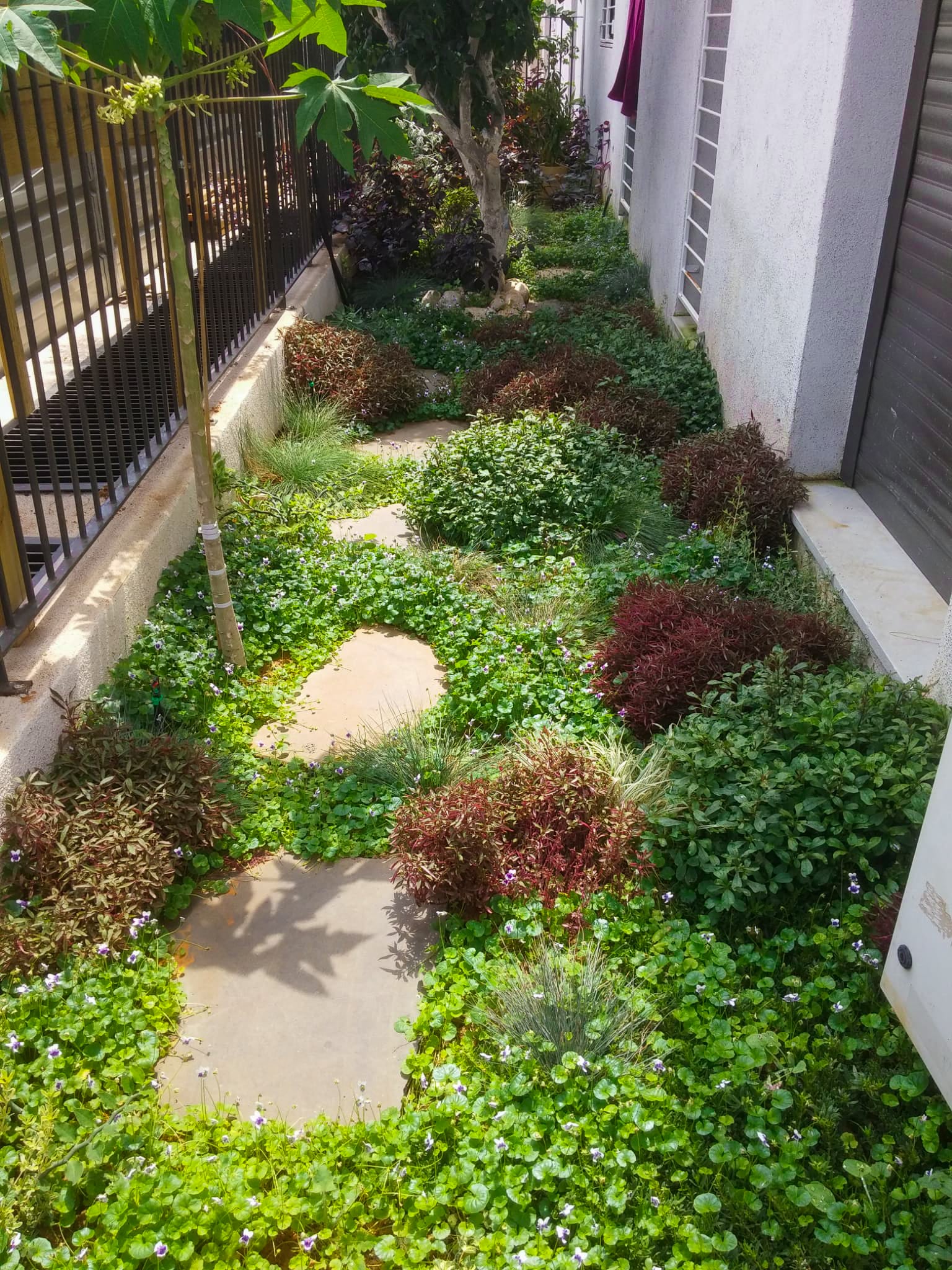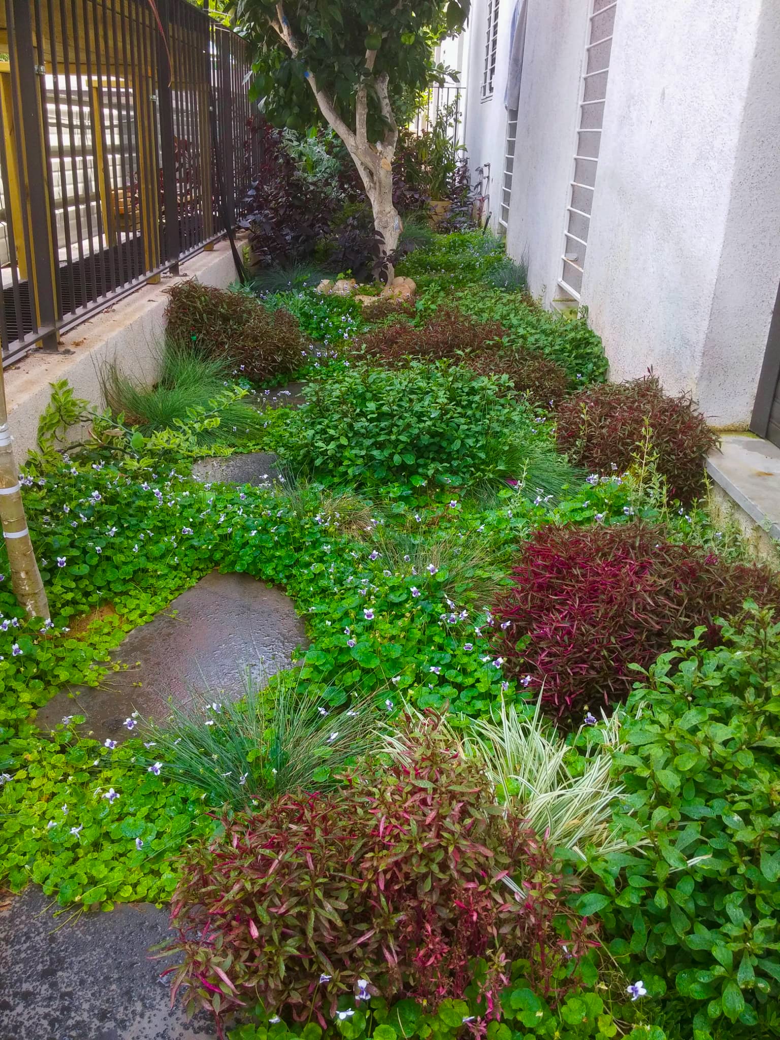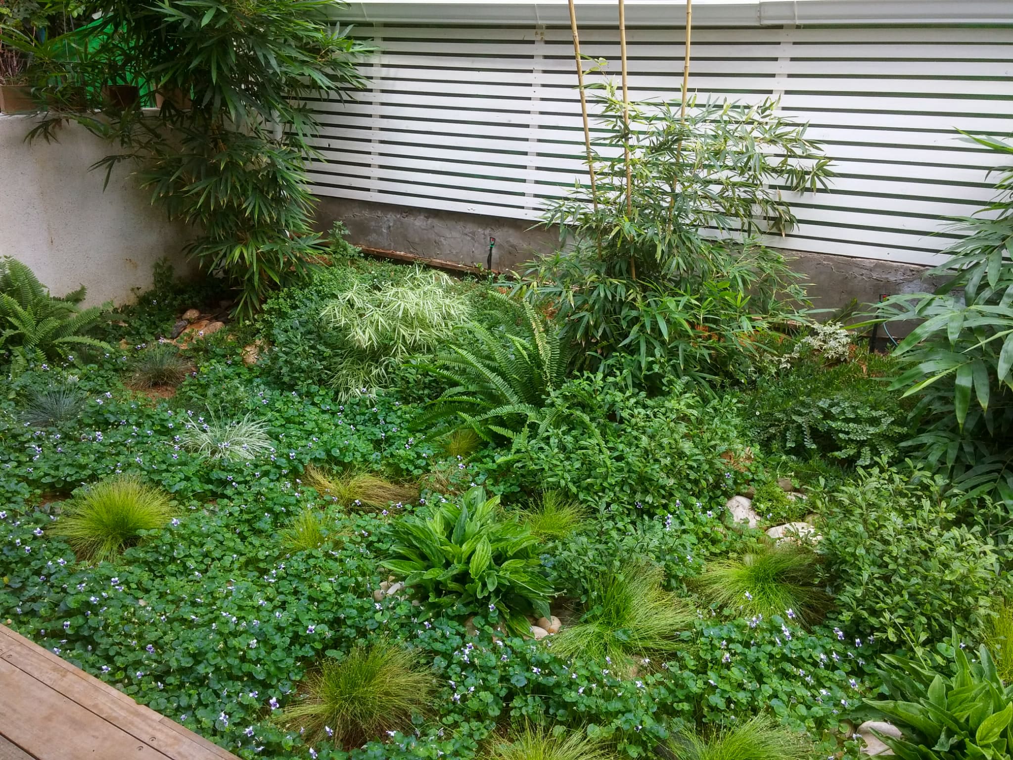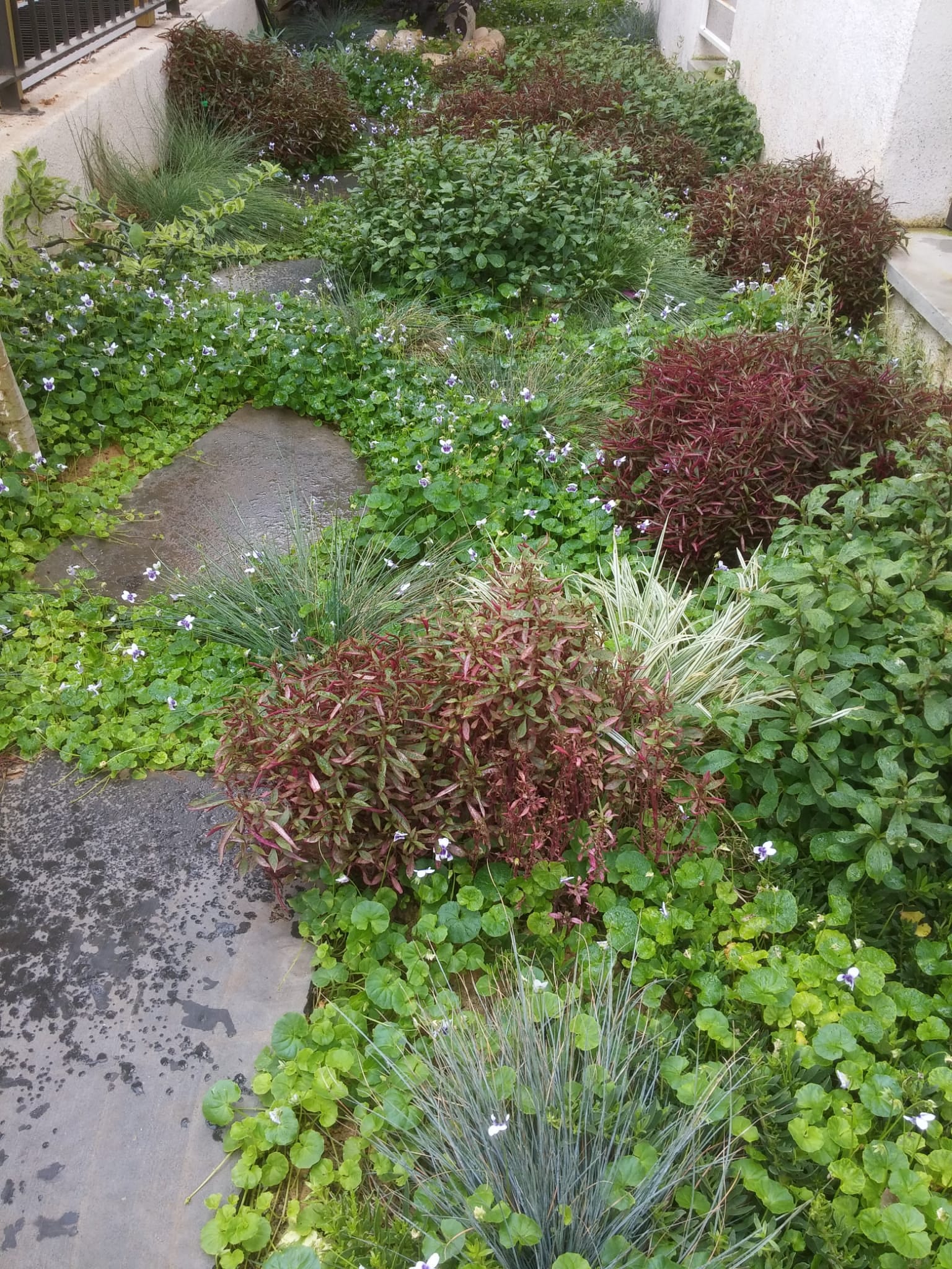 גינה מיוחדת, מורכבת מצמחיה שלא נמצאת בדרך כלל בגינות. סגנון יפני נקי ומינימליסטי הן במגוון והן בצבעים - שילוב של צמחיה ירוקה וסגולה עם אבנים, גדר לבנה נקיה