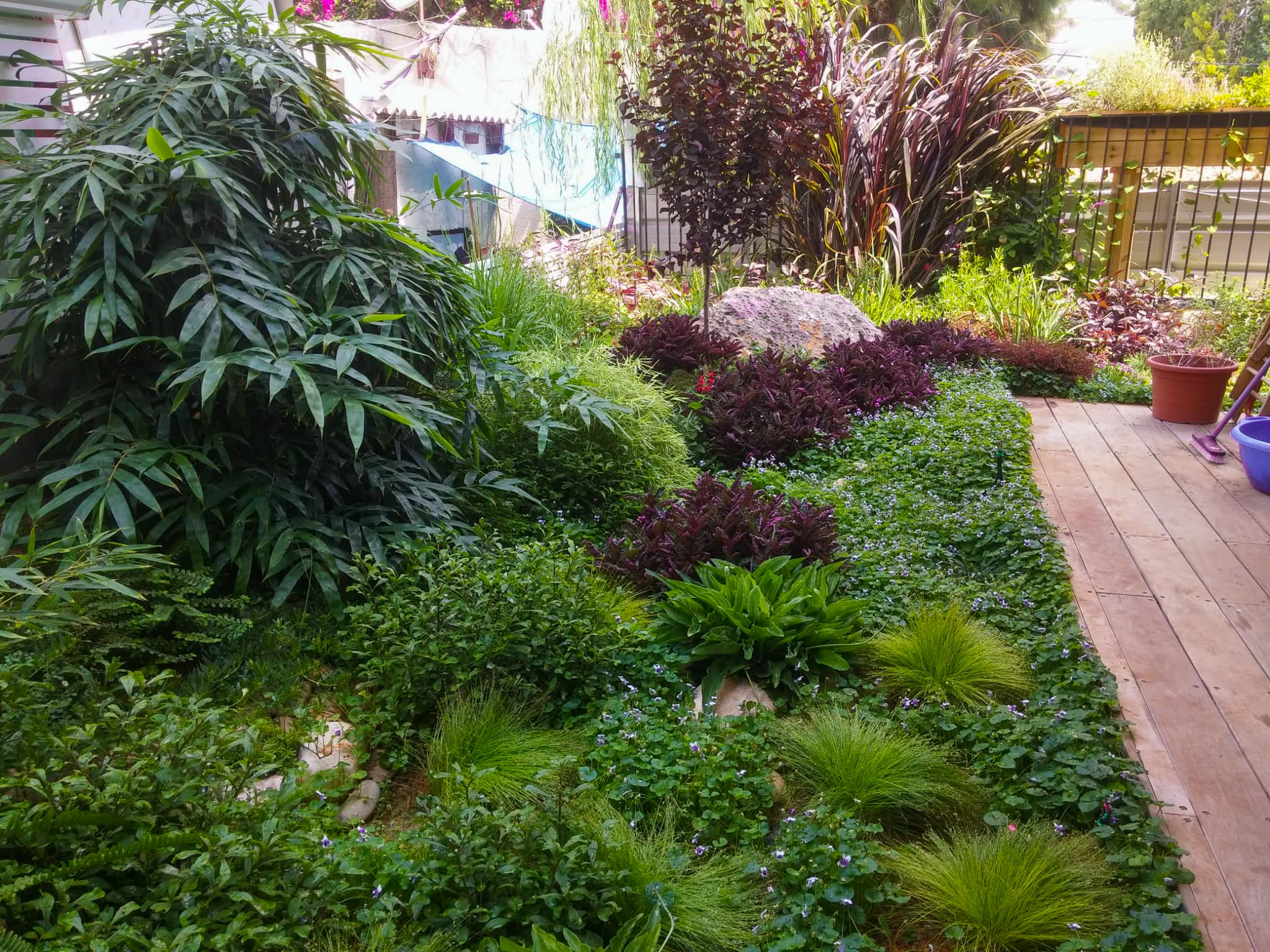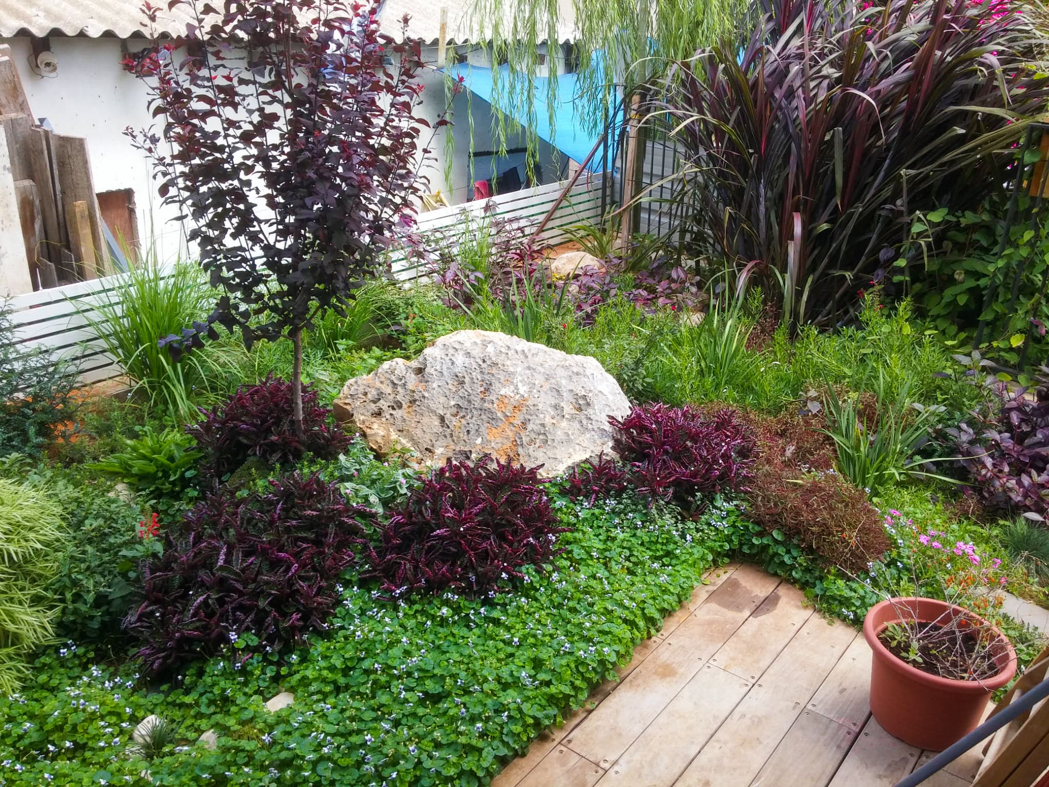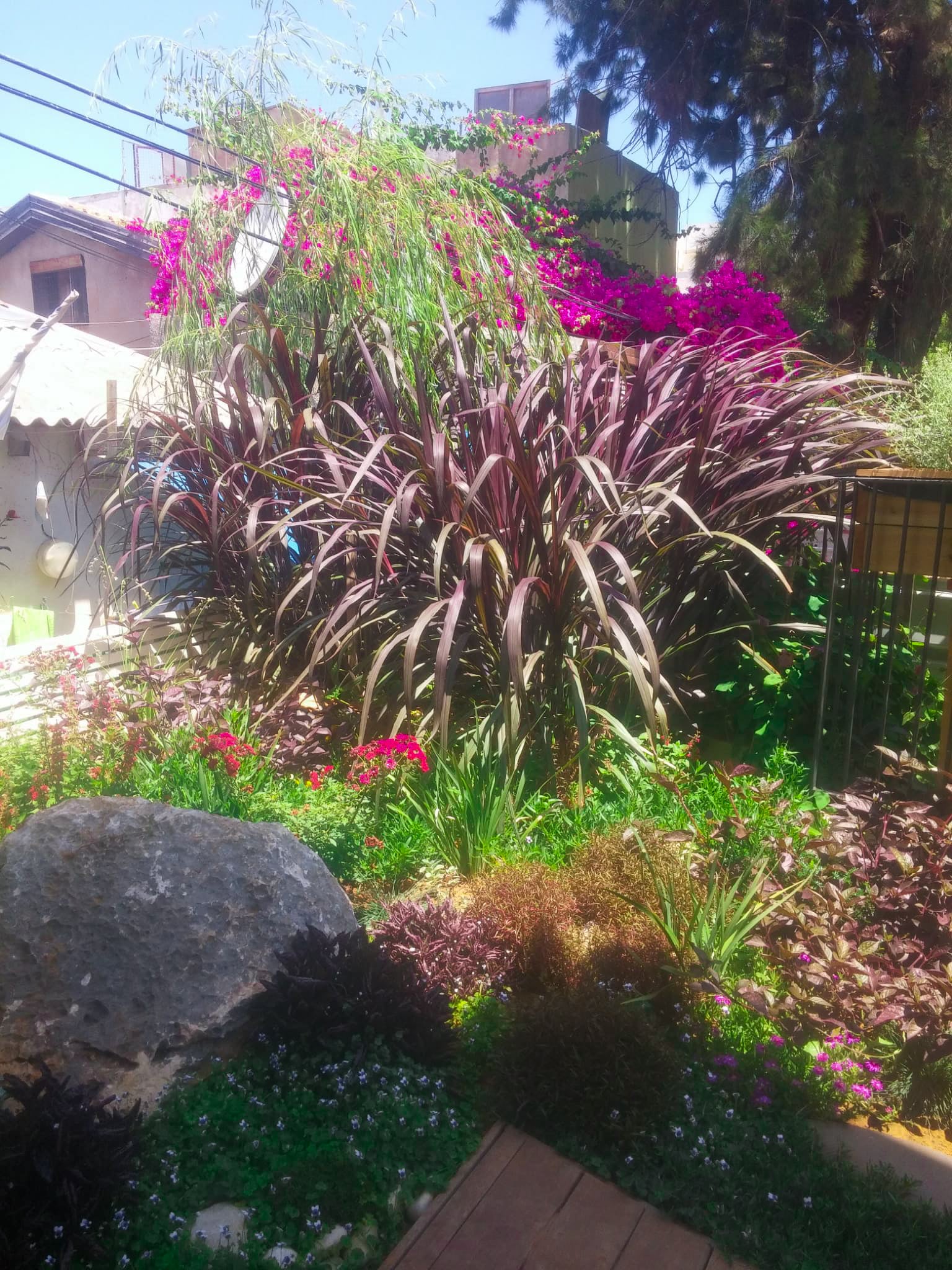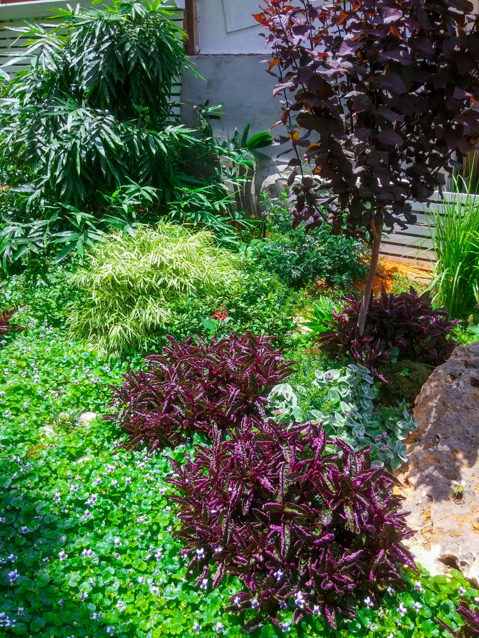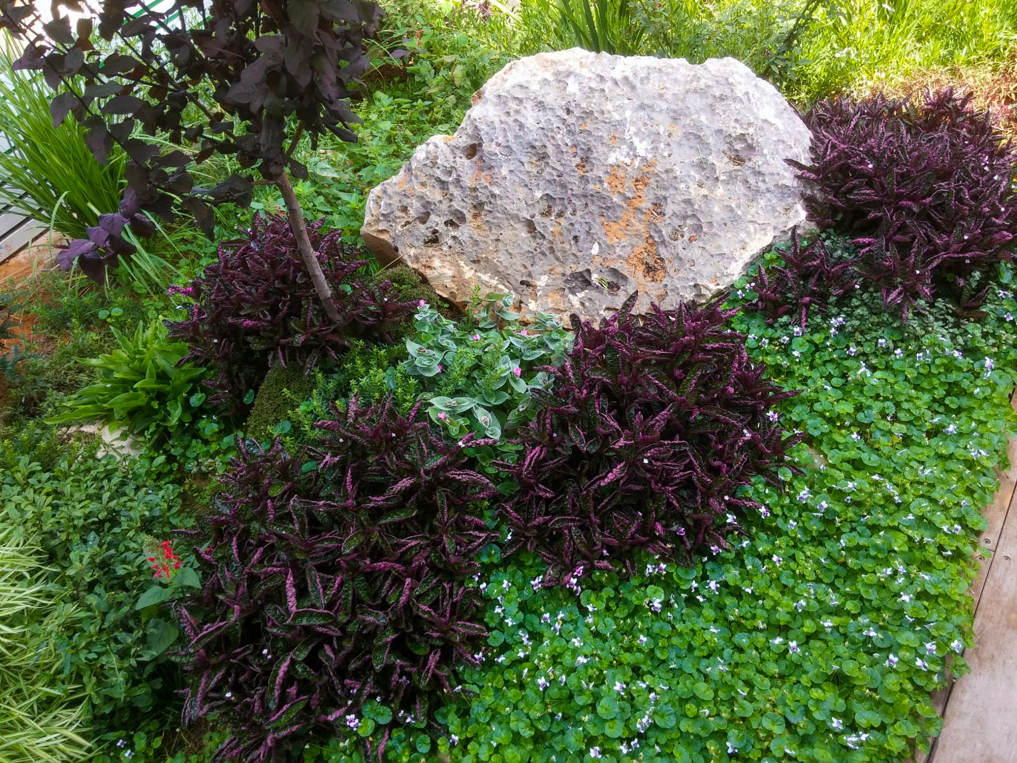 גינה מיוחדת, מורכבת מצמחיה שלא נמצאת בדרך כלל בגינות. סגנון יפני נקי ומינימליסטי הן במגוון והן בצבעים - שילוב של צמחיה ירוקה וסגולה עם אבנים, גדר לבנה נקיה