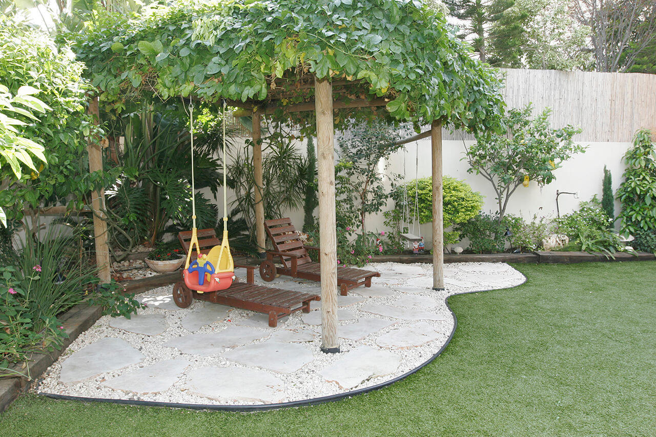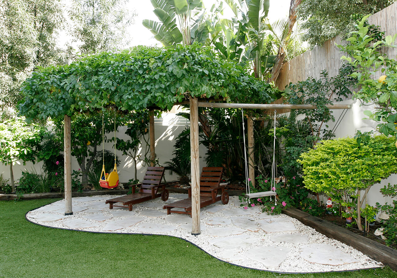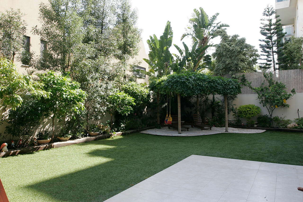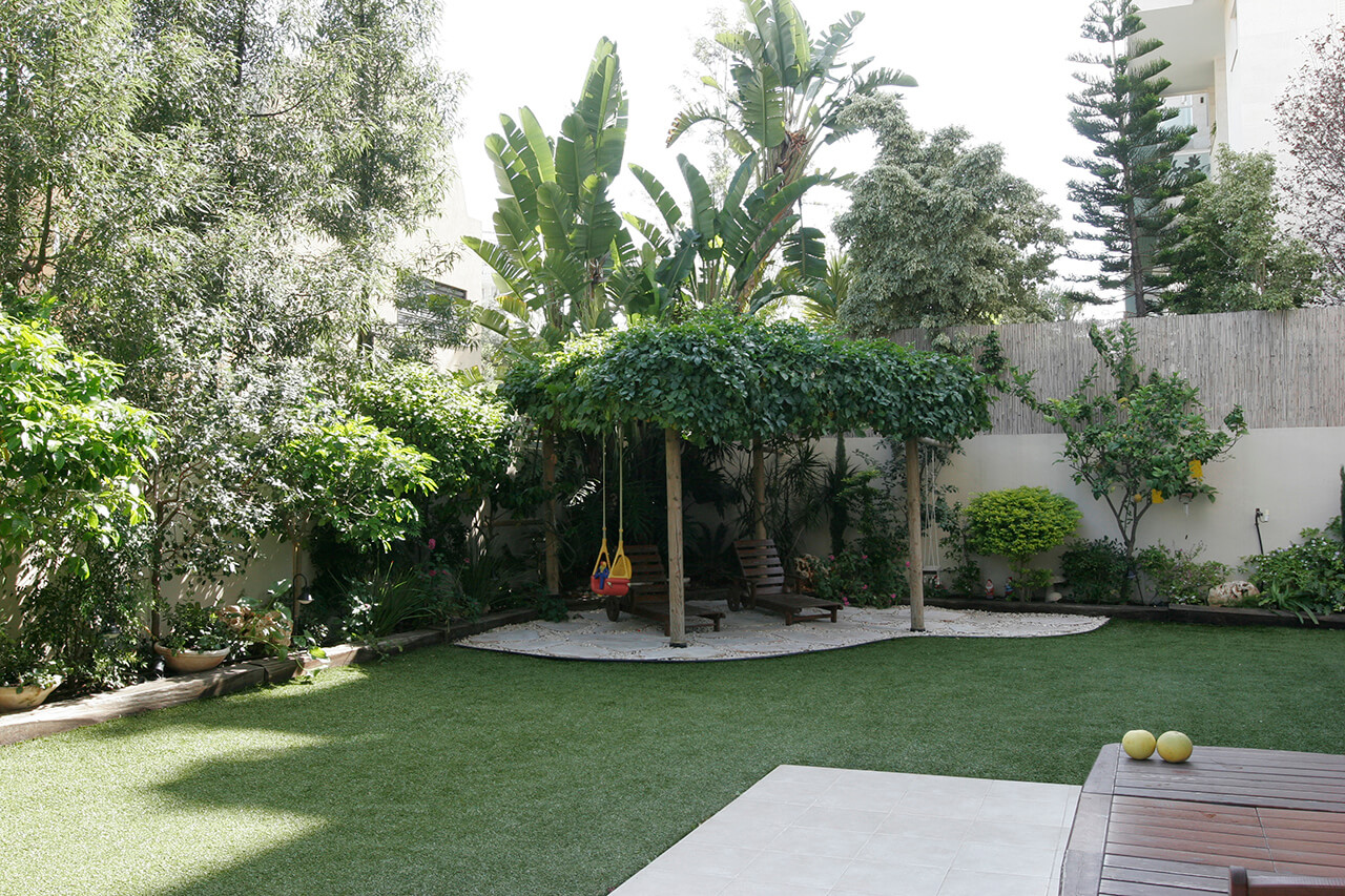 גינה פרטית המשלבת צמחיה חיה ודשא סינתטי
